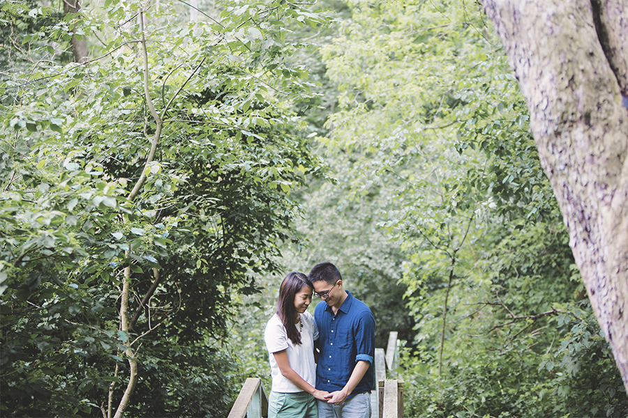 | Even though this engagement session had a rainy start, these two stuck it out, smiling and just enjoying each other's company at every step! We could try to describe how cute these two are together, but the photos below will show you :). They wanted a forest-type engagement in Toronto, so we headed by the Don Valley River to enter just into the outskirts of the overgrown. There are tons of hiking paths (and mountain bike paths!) around this area which would be awesome to explore on a day trip! Anyways, check out the greenery we discovered below!